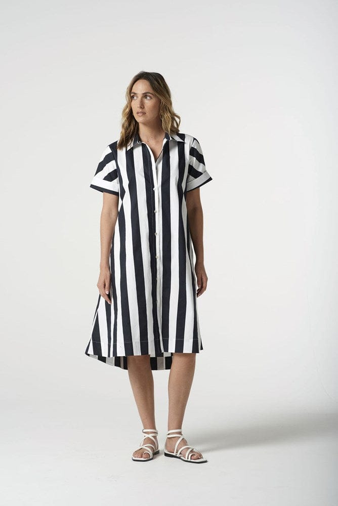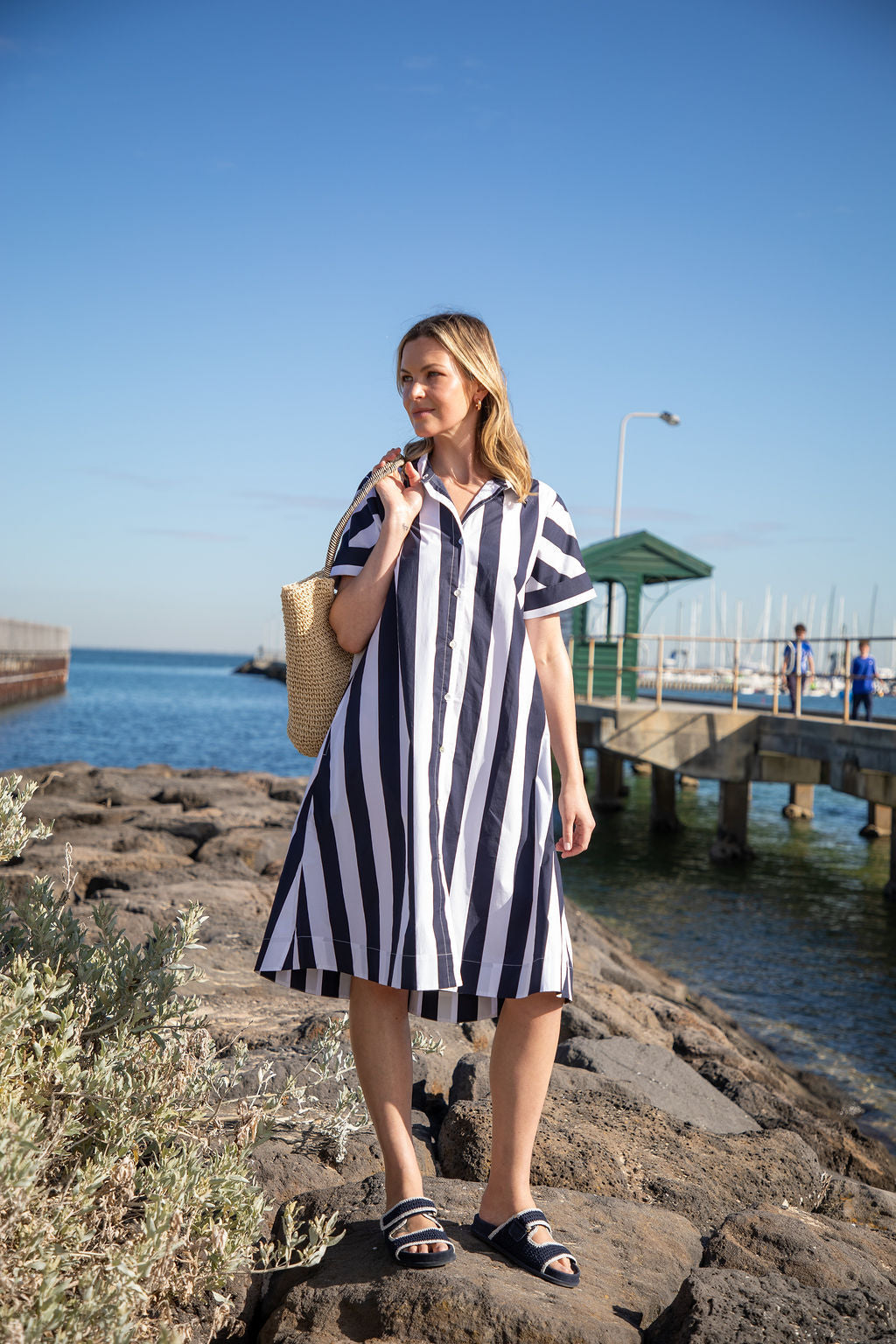 Classic and comfortable, the Goondiwindi Cotton ¾ Sleeve Thick Stripe Dress in Navy Stripe features a timeless design with bold stripes and a relaxed silhouette. Perfect for effortless everyday style.