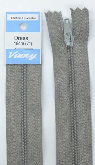 This Dress Zip- 18cm (7 inch)- 305 PEARL GREY is a high quality nylon zip with a metal zip pull on a 100% polyester tape. This closed end zip is great for dresses, trousers as well as cushions & craft projects where the zipper will be visible if not covered.