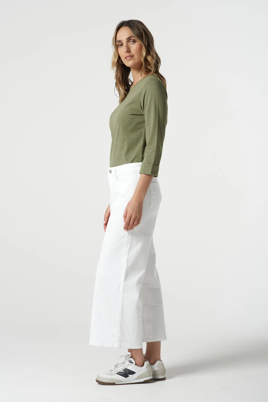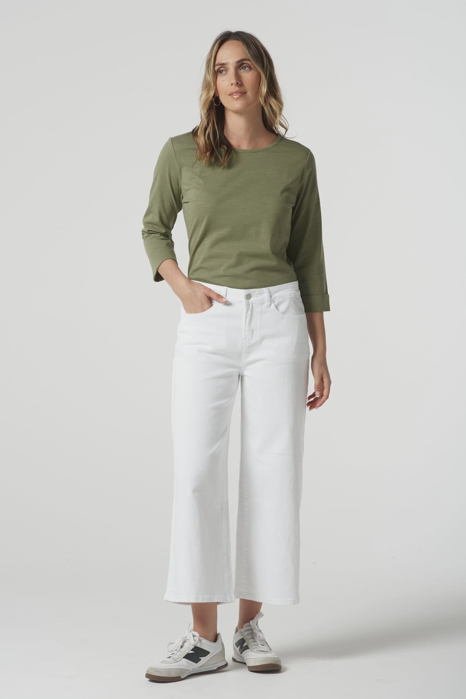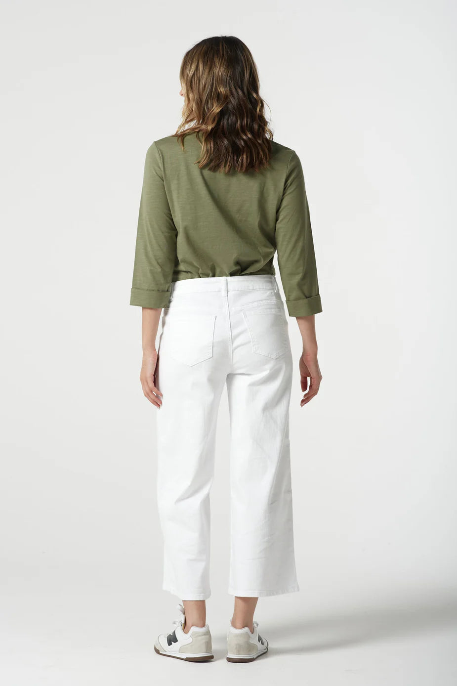 Our 5 Pocket Crop Wide Leg Jean in white is made from our signature cotton fabric with a touch of stretch for all-day comfort and ease. The wide-leg, cropped cut offers a fresh, flattering shape that pairs effortlessly with everything from crisp shirts to relaxed knits, blouses or tees.