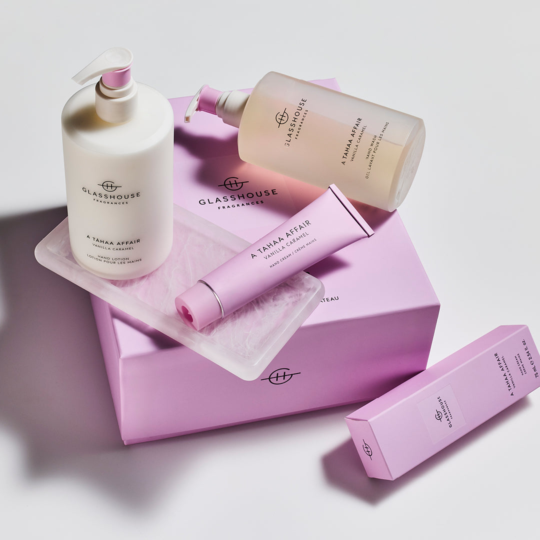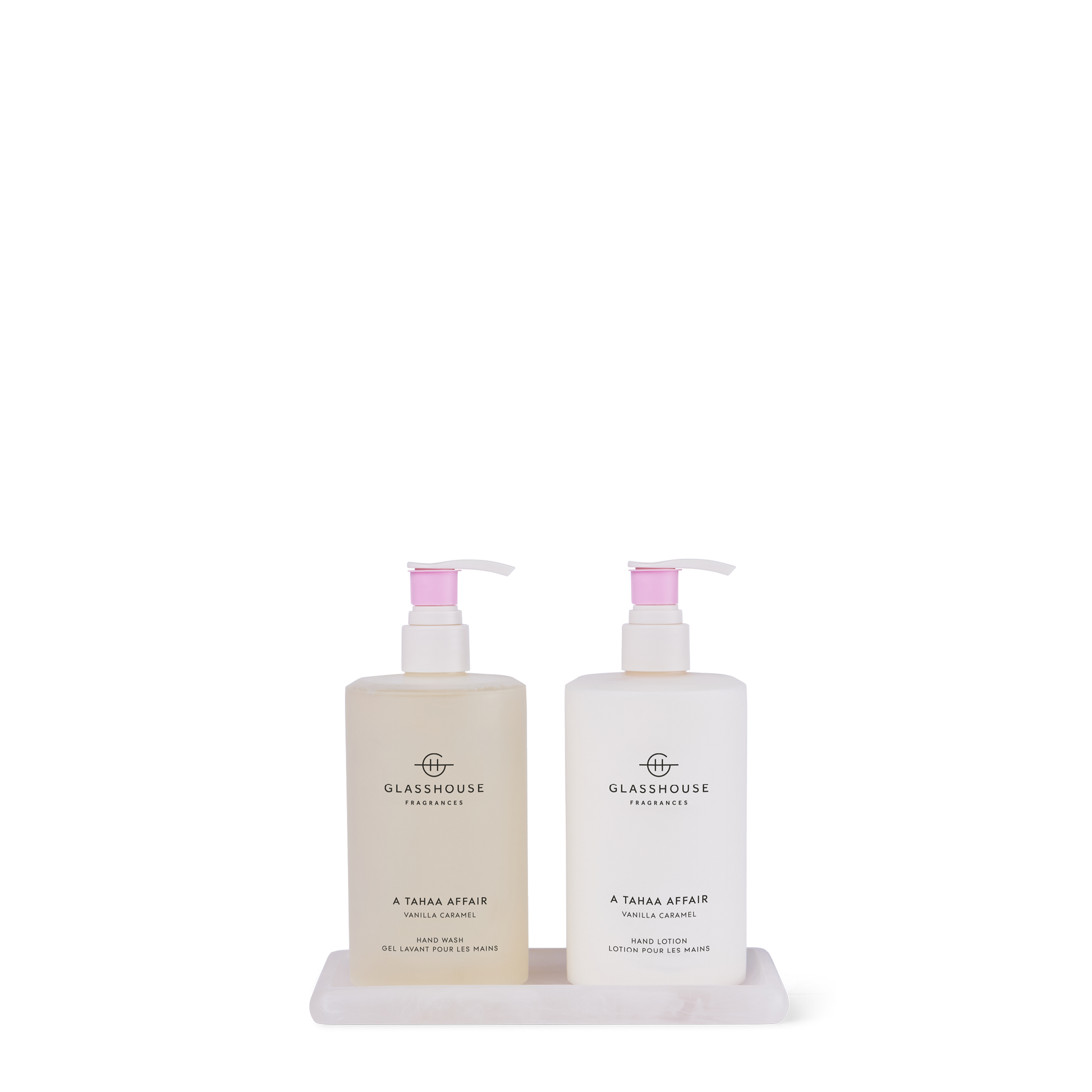Contains: 1 x 450mL Hand Lotion, 1 x 450mL Hand Wash, 1 x Bespoke Resin Tray.