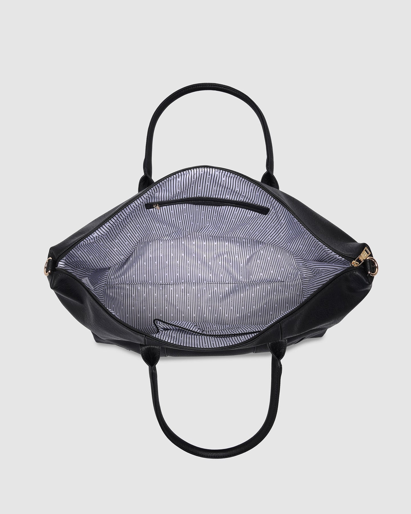 The Louenhide Alexis Black Weekender Travel Bag with Stripe Strap is a perfect carryall for overnight or weekend adventures! Feel luxe and invest in a quality, soft, and easy clean vegan leather Louenhide travel bag. This new design is a sporty twist on a Louenhide best seller, now featuring a fun statement stripe webbing extension strap. Wide opening and spacious, this weekender is just the right size to fit your travel essentials. Carry the bag effortlessly by the top handles, or wear on your shoulder with the detachable extension strap, for added comfort. Now comes with a handy back zip pocket to quickly access keys or other valuables.