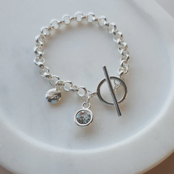 Make a statement with this beautiful bracelet. Adorned with a dazzling gold heart pendant, this bracelet features a classic toggle clasp for an exclusive look. Classic and timeless, this fashionable piece adds a luxurious, sophisticated touch to any outfit.