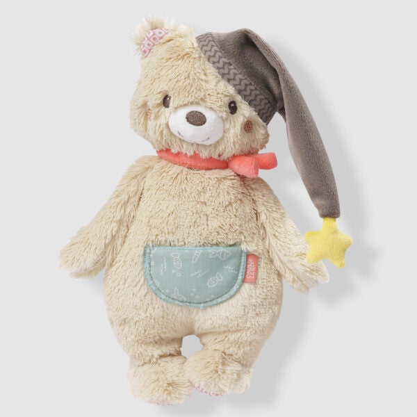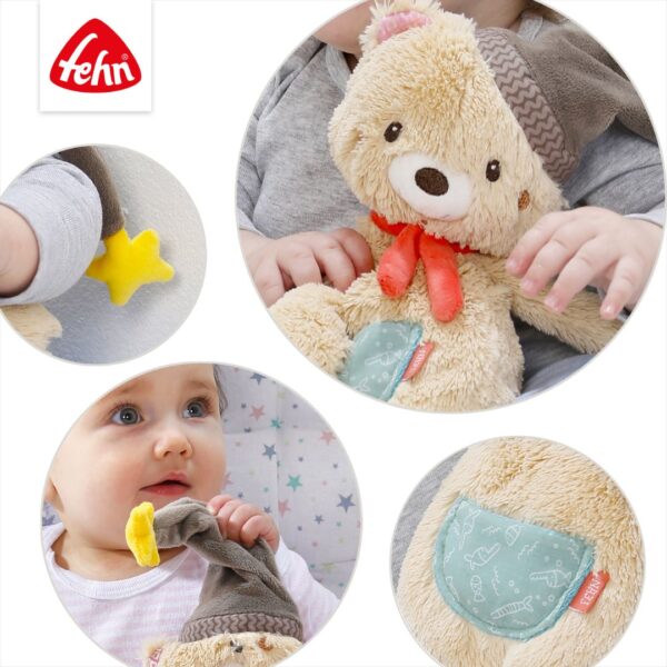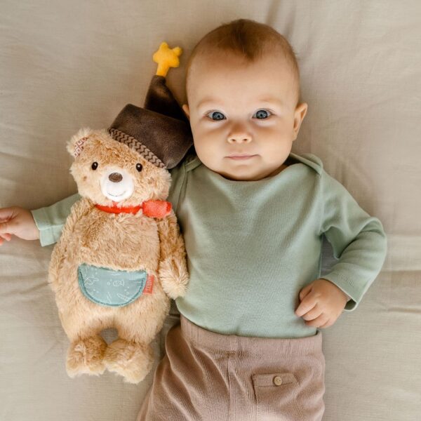 The Cuddly Toy Bear is a soft and versatile companion for babies aged 0+ months, perfect for grasping, touching, and snuggling. With a fluffy coat, sparkling brown eyes, and a nightcap for exploring, it serves as a playmate by day and a guardian at night. Featuring a practical belly pouch for stowing dummies, this cuddly bear makes an ideal gift for baby showers, birthdays, or special occasions.