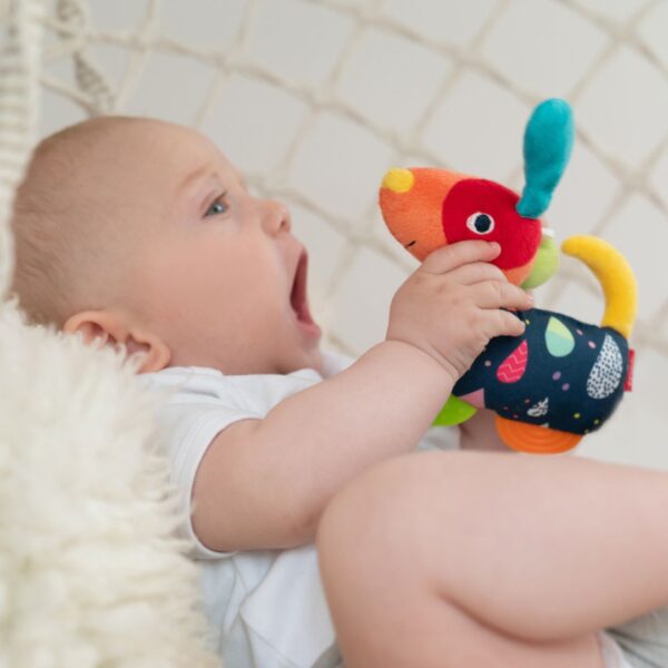 The Grabber Dog with Teether is a soft toy for babies aged 0+ months, designed to stimulate senses, support motor skills, and provide teething relief. Featuring a rattle, squeak, and soft teethers, it encourages grasping and exploration while soothing discomfort during teething. Lightweight and portable, it’s perfect for play at home or on the go and makes an ideal gift for baby showers, birthdays, or special occasions.