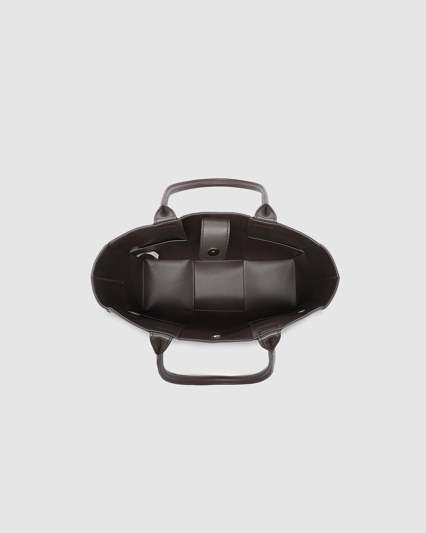 The Gwen Chocolate Handbag brings quiet confidence to your everyday style — structured, textural, and effortlessly composed. Designed in a clean, tailored silhouette, this woven shoulder bag showcases smooth vegan leather and is finished with dual top handles for a refined touch. Compact yet considered, Gwen Chocolate offers just the right amount of space for your daily essentials, secured with a discreet magnetic closure for ease and peace of mind. Her woven detailing softens the structure, creating a thoughtful balance between grounded texture and elevated design. Equally suited to weekday plans and weekend errands, Gwen Chocolate’s timeless silhouette works hard in any wardrobe