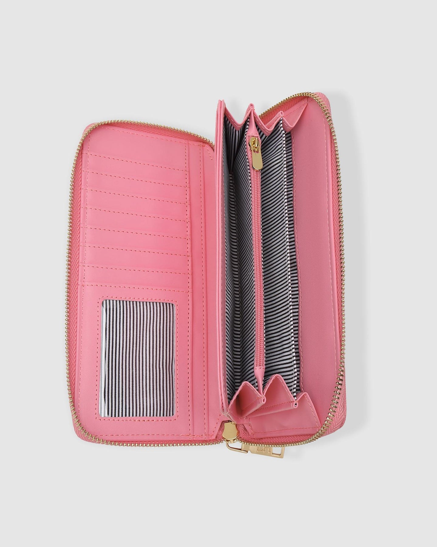The Louenhide Jessica Bubblegum Pink Wallet is a classic and elegant carryall that is a customer favourite season after season. Sleek and compact with plenty of storage for cards, notes, and coins, the Jessica Bubblegum Pink is the perfect zip around continental wallet for everyday use. Slip easily over your wrist with its detachable wristlet for a clutch option on a night out!