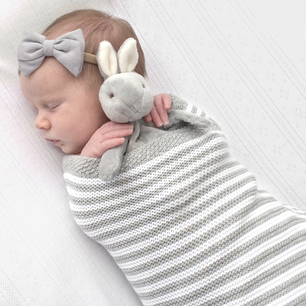 - Versatile and light weight, this gorgeous 100% cotton pearl knit blanket features a classic contrasting stripe. Perfectly sized for the bassinet or pram with a hint of stretch to avoid bunching the mattress.