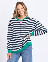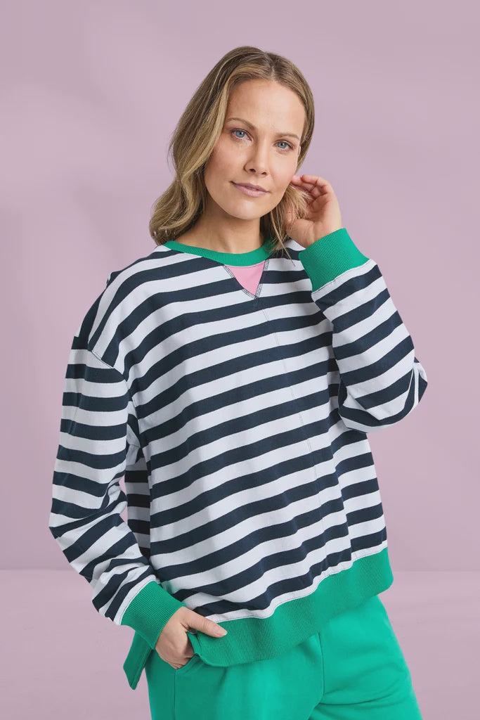The Elm Maps Crew is a relaxed, oversized layer featuring yarn-dyed stripes and contrast rib detailing.