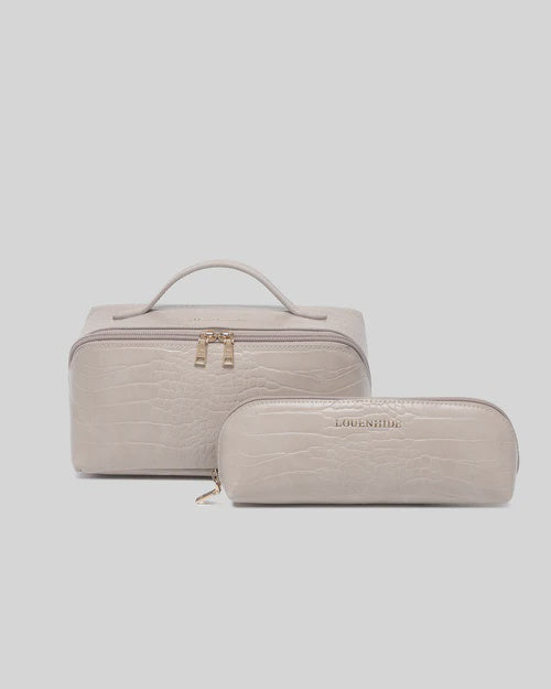 The Louenhide Mary Jayne Croc Putty Cosmetic Bag Set are designed with ultimate convenience in mind. No more digging around or struggling to find what you need, with Mary's spacious interior and Jayne's slim silhouette, these women's cosmetic cases are ready to streamline your beauty essentials for those on-the-go moments. Ready for touch-ups anytime, anywhere, their spacious interiors are ready to organise your beauty must-haves. Whether you're heading to the office, a dinner date, or weekend getaway, this makeup bag set keeps you looking polished and put together. Stay stylish, stay prepared and slip Mary Jayne Croc Putty into your travel bags. *Beauty products not included.