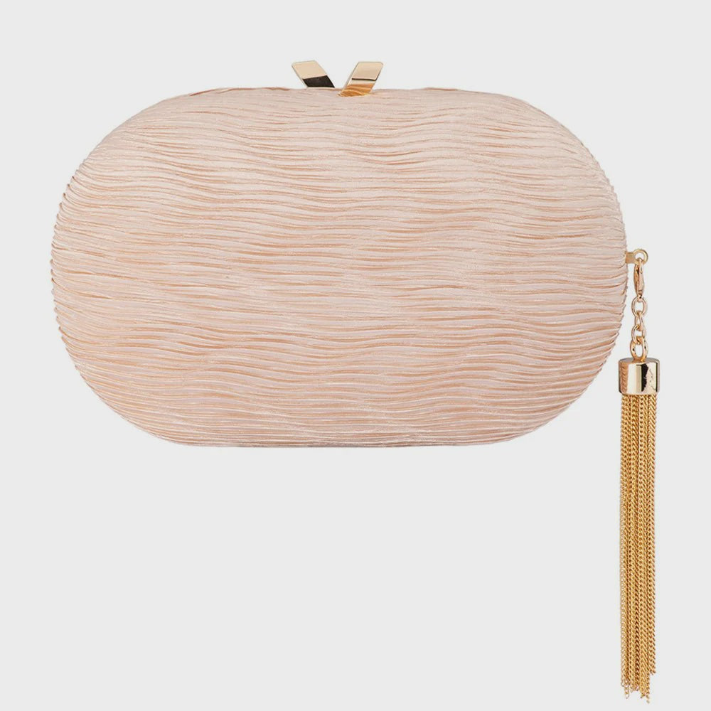 The NATALIE Pleated Oval Clutch is the perfect blend of luxury and function. With its intricate pleated satin fabric, timeless hard case design, tassel feature and convenient removable shoulder chain, this satin bag is the ideal accessory for any special occasion.