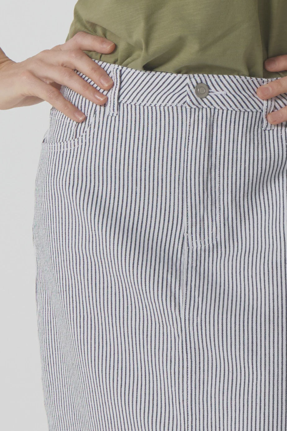 Our 5 Pocket Knee Length Skirt in navy and white is made from a yarn-dyed cotton stripe with a touch of stretch for comfort. With a classic five-pocket design and flattering straight cut, it’s an easy, versatile piece to pair with tees, shirts or lightweight knits.
