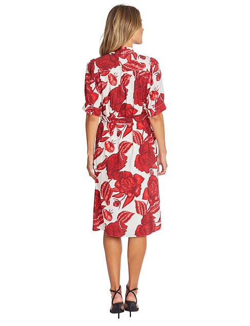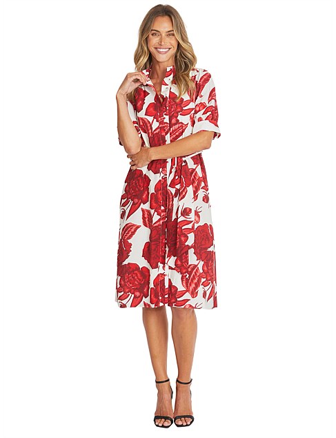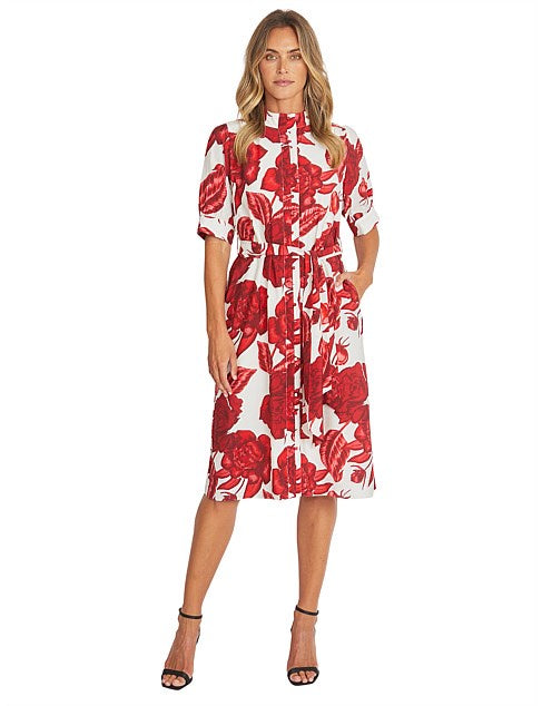Make a statement with the Valencia Belted Dress, featuring a vibrant red floral print on a soft and breathable viscose/nylon blend. This elegant midi-length dress is designed with a high neckline and a buttoned front placket for a refined, structured finish.Subtle puff sleeves that fall just above the elbow add a touch of femininity, while the self-tie belt cinches the waist to flatter the silhouette. Perfect for garden parties, special occasions, or a polished day look.