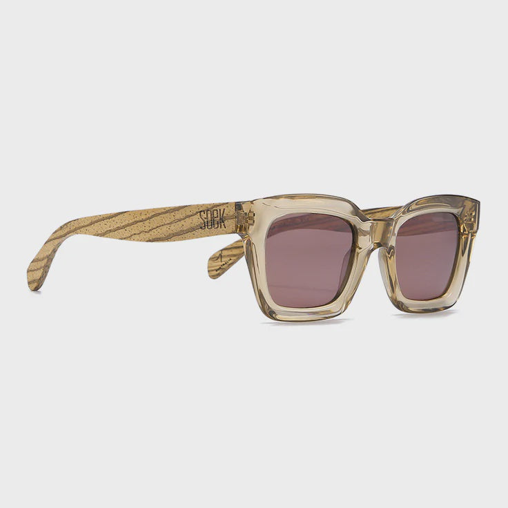 Our best-selling, 90s inspired Zahra sunglasses are a mid-sized style that will suit most face shapes and sizes. Zahra sunglasses are now available in a flattering champagne tone with polarised smoky tinted lenses.