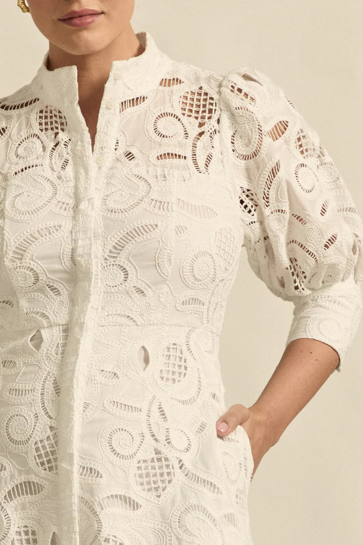 Its intricate lace, sculptural sleeves and refined finish create a dress destined for special moments.